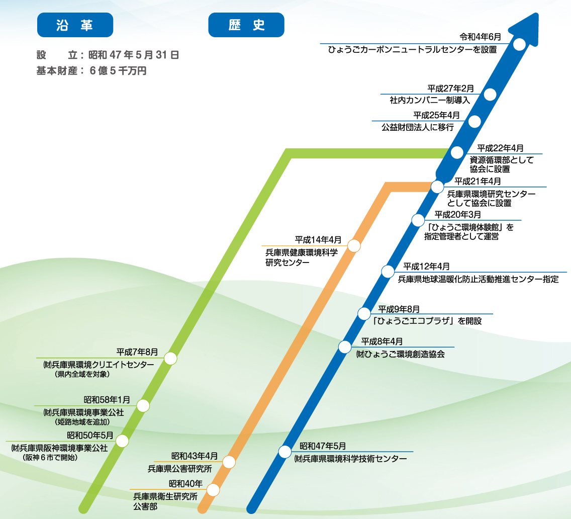 設立50周年記念誌 ・沿革・事業紹介 環境創造事業 循環型社会推進事業・太陽光発電事業 環境調査・測定分析事業 環境研究事業 国際協力事業