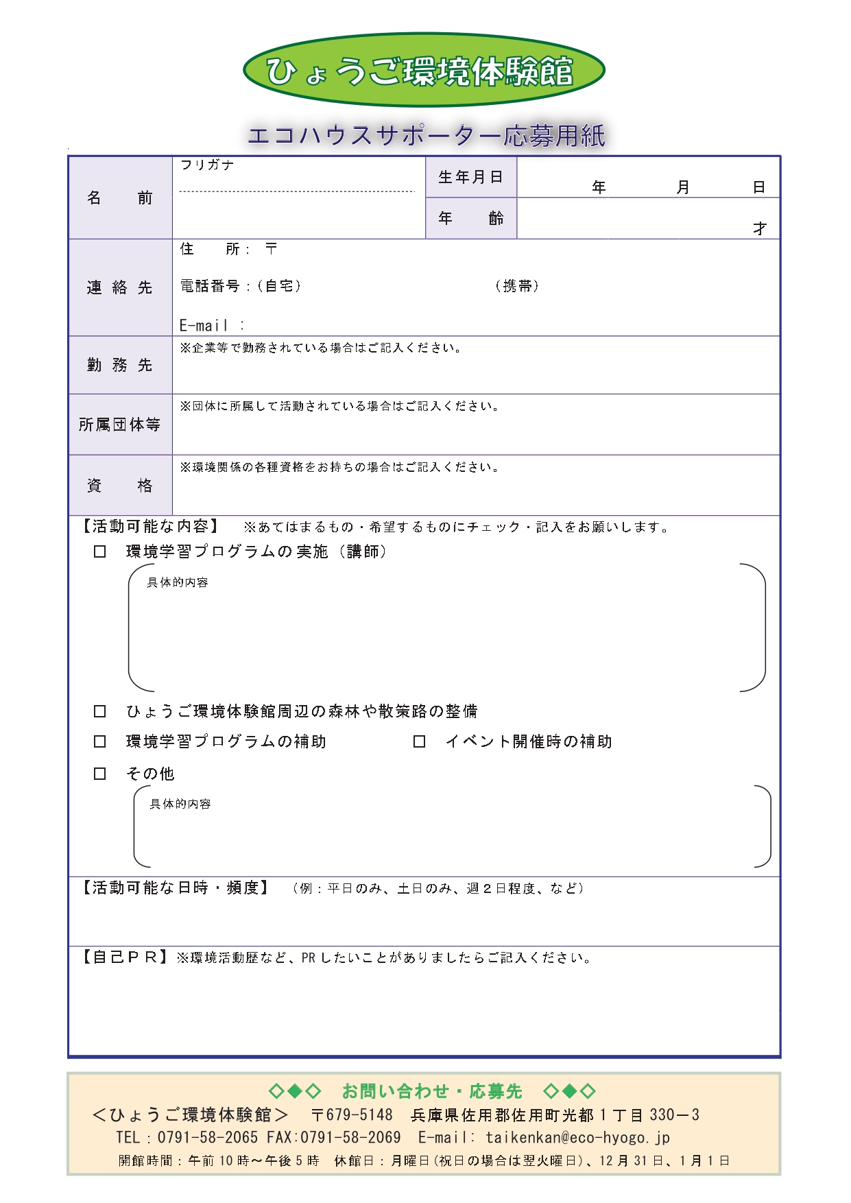 ホーム > 新着情報一覧 > ひょうご環境体験館 エコハウスサポーター募集のお知らせ